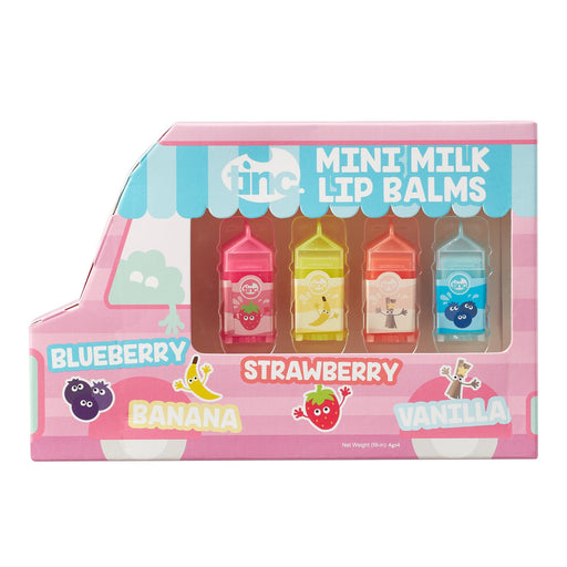 Find your new favourite flavour lip balm with our set of 4 mini milk carton lip balm set. Flavours include: Blueberry, Banana, Strawberry & Van...